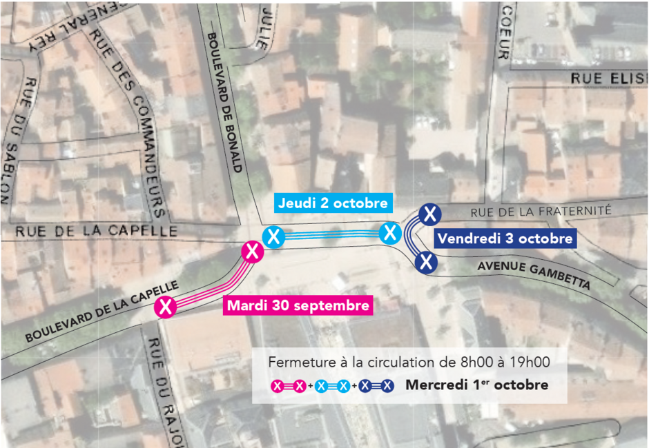 - Le 1er octobre : fermeture de la place de Capelle, le haut de l'avenue Gambetta jusqu'à la rue de la fraternité et du boulevard de la Capelle de la place à la rue du Rajol ;
