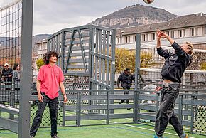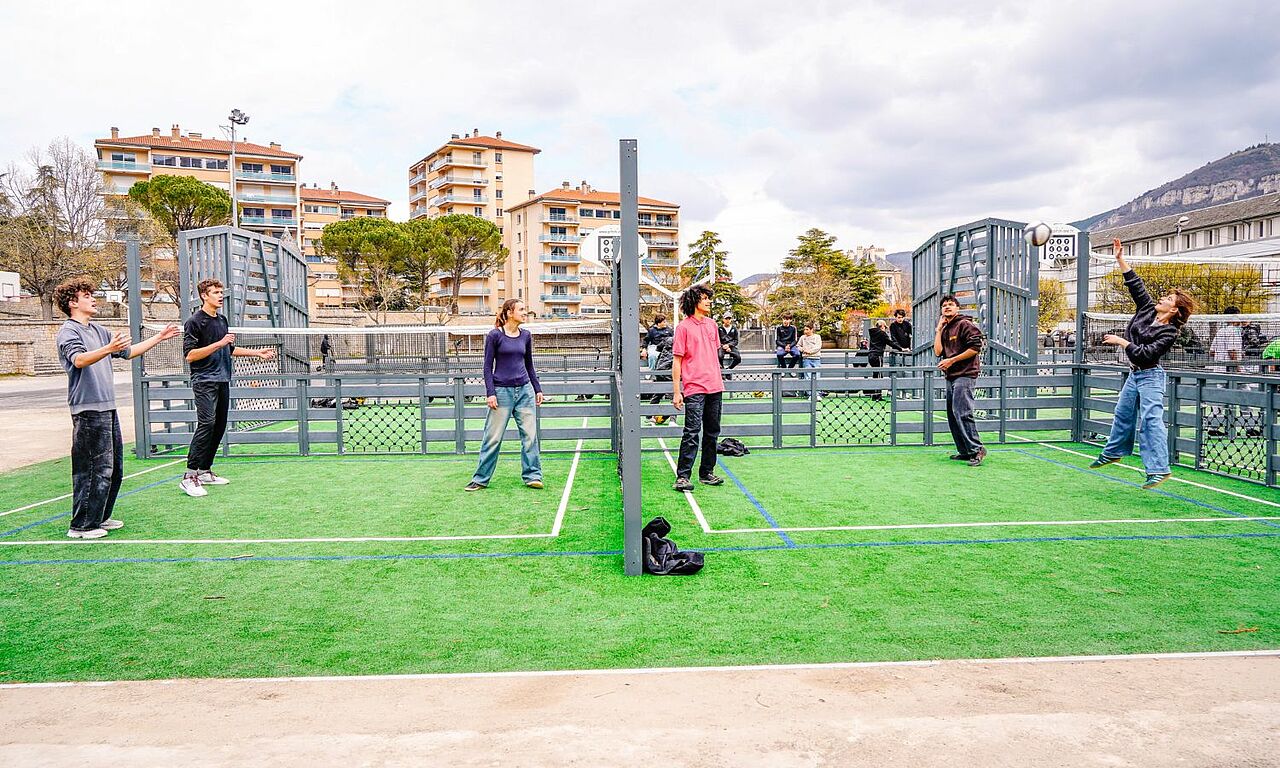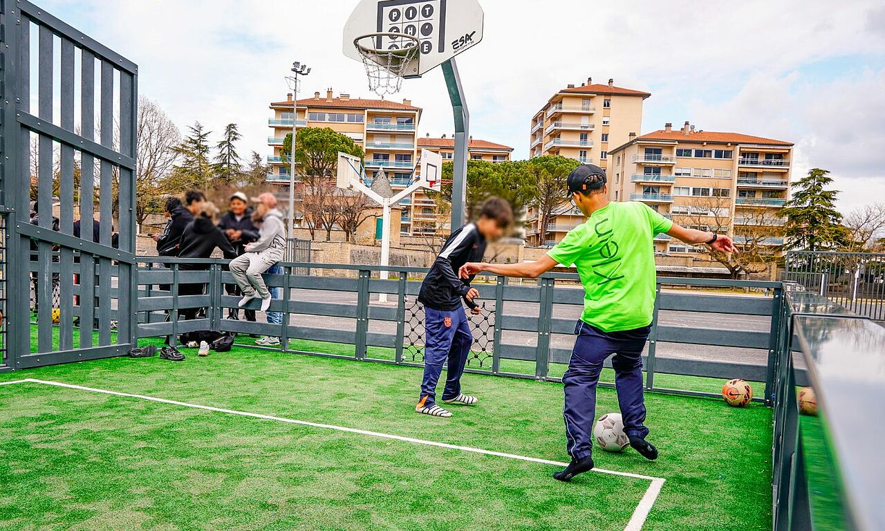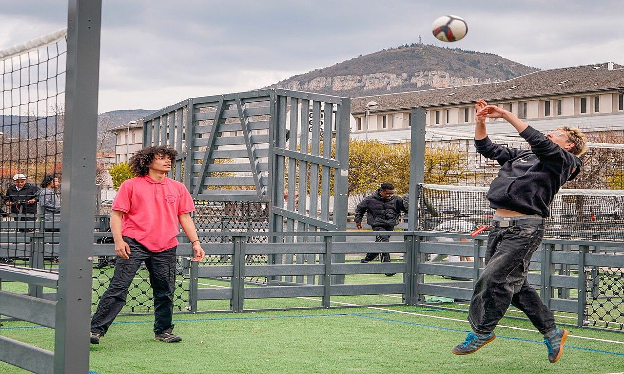 Le modèle « pitch one » de ce city stade permet la pratique de différents sports dans 5 espaces différents : le football, mais aussi le tennis-ballon, le basket pour les sports de balle. A noter qu’il est aussi possible de jouer au football sans gardien grâce à une barrière spécifique. A côté, deux terrains de badminton et deux terrains de volley sont dotés de filets à différentes hauteurs afin de favoriser la pratique pour tous les âges et tous les gabarits.