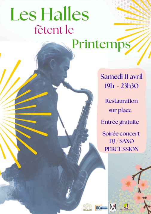 Le11avrilà 19h00 Tout publicFêteNocturne des halles Pour fêter le printemps, les commerçants des Halles de Millau vous accueillent pour une nocturne !Ajouter à mon calendrierSamedi 11 avril à partir de 19hAnimation musicale dans les Halles avec DJ Ced M Event et Alexandre Abassi au saxo et percussionsRestauration sur placePrécédentRetour à la listeSuivant