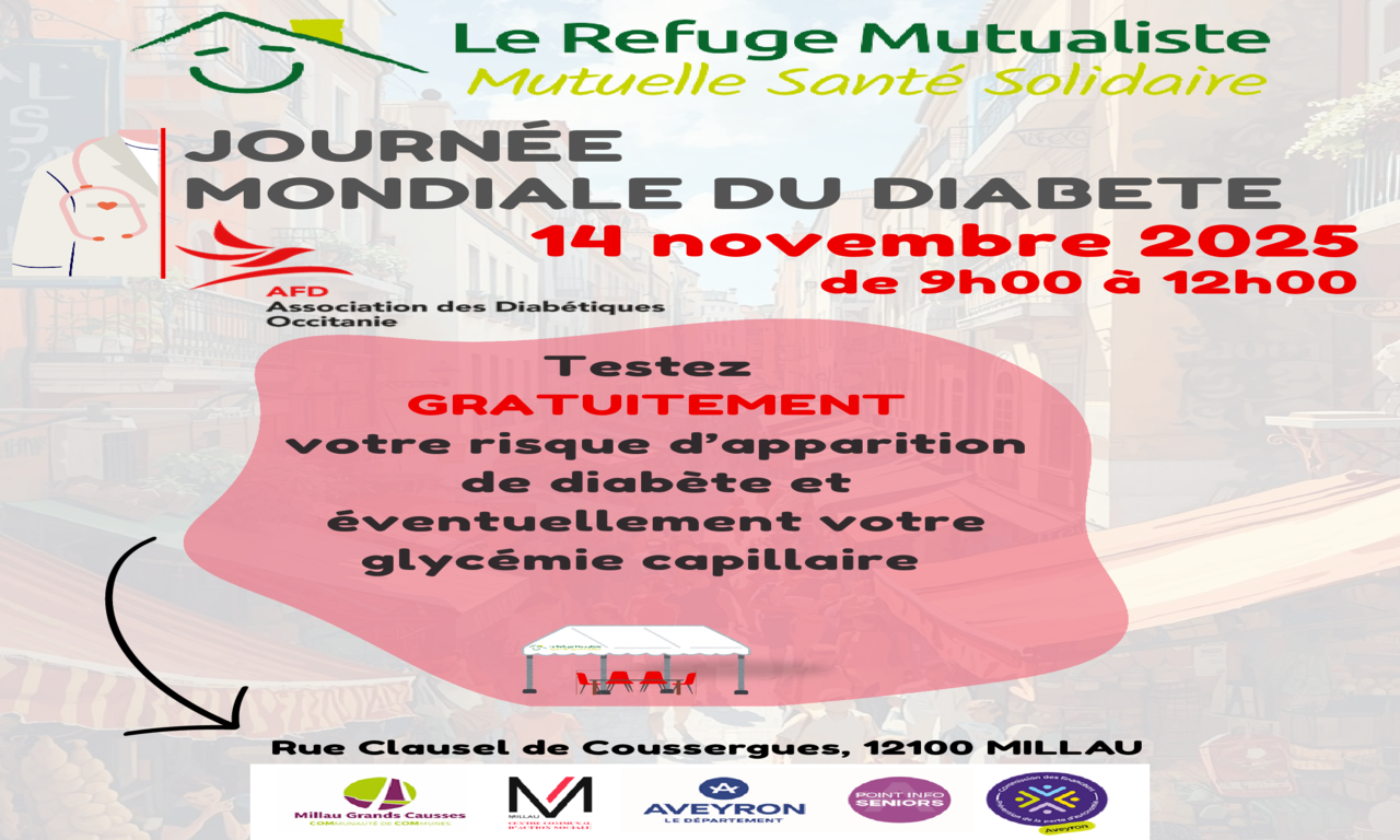 Ajouter à mon calendrierLe Refuge mutualiste en lien avec l'Association Diabète Occitanie et en présence du Point Infos Seniors Millau Grands Causses organisent une sensibilisation sur le dépistage du diabète, le vendredi 14 novembre sur le marché. Ils occuperont un stand rue Général Clauzel de Coussergues
