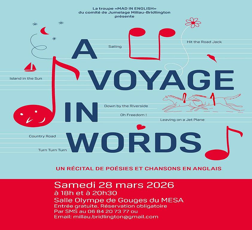 Ajouter à mon calendrierBarbara Dugrip et sa troupe « Mad in English » nous propose un nouveau spectacle de poèmes et chansons intitulé « A voyage in words » dont vous trouverez l’affiche en pièce jointe.
