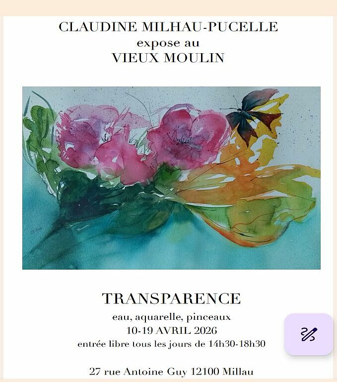 Du10avrilà19avrilDu 14h30 à 18h30 Tout public, GratuitExpositionExposition d'aquarelle de Claudine Milhau Pucelle Claudine Milhau-Pucelle expose au Vieux Moulin du 10 au 19 avril 2026.Ajouter à mon calendrierLe Vieu Moulin accueille la peintre Claudine Milhau Pucelle et son travail d'aquarelle. "Transparence" eau, aquarelle, pinceaux est a découvrir tous les jours de 14h30 à 18h30. 27 rue Antoine GuyPrécédentRetour à la listeSuivant