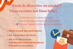 Envie de décrocher un emploi ? Venez recruter votre futur employeur lors d’un forum original et inclusif, pensé pour favoriser des échanges simples, directs et sans stress.