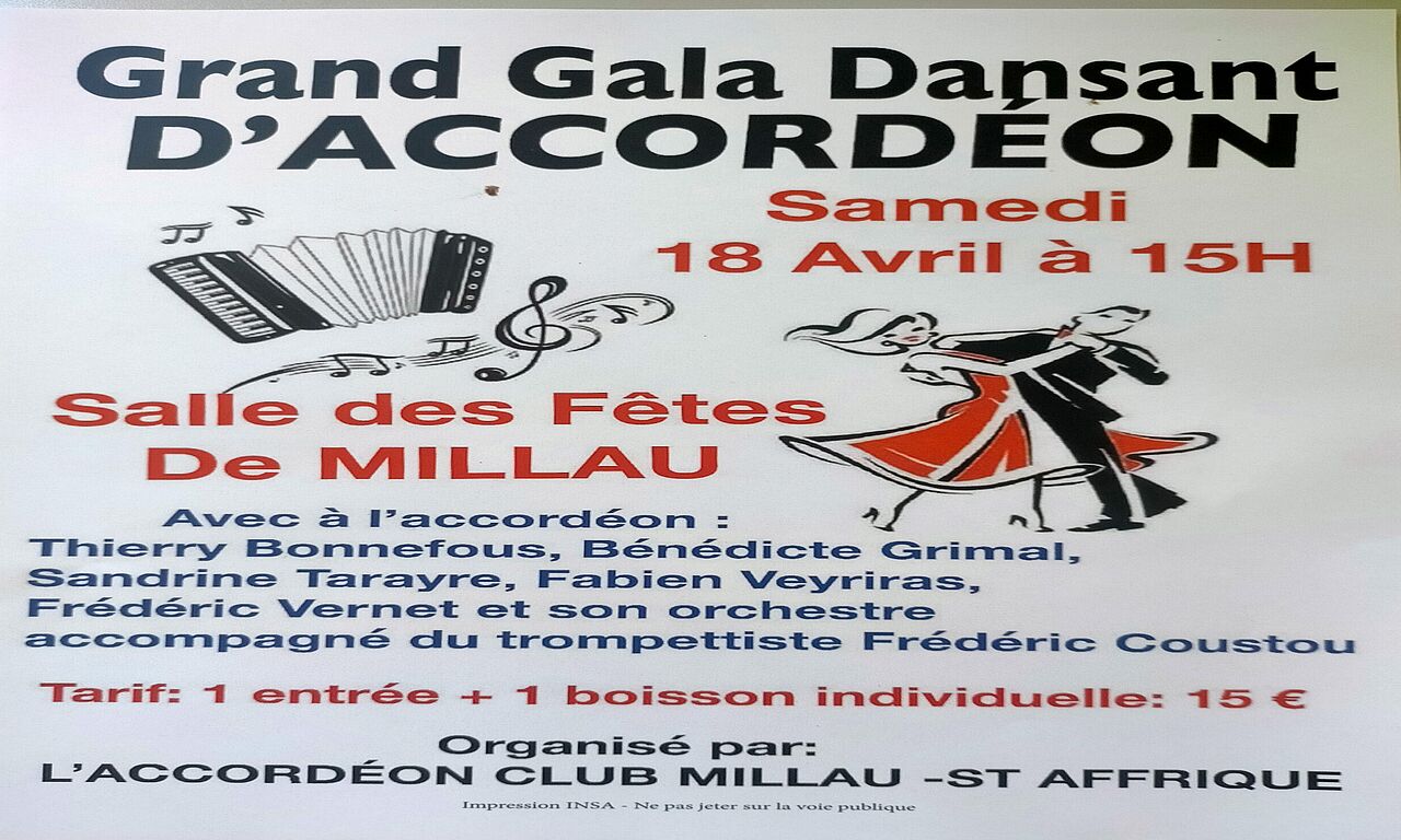 Le18avrilDu 15h00 à 20h00 Tout public, PayantConcertgrand gala dansantgrand gala d'accordéon dansant avec la participation de Th.Bonnefous, S.Tarayre ,F Vernhet, B.Grimal, F.Veyriras et F.CoustouAjouter à mon calendrierGrand gala organisé par l'accordéon club Millau-Saint Affrique pour le 50 ème anniversaire de l'association. Entrée payante 15 euros avec boisson. PrécédentRetour à la listeSuivant