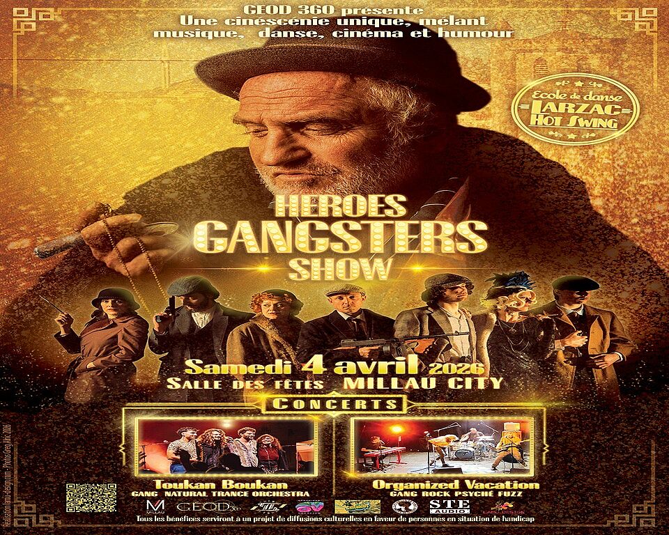 Ajouter à mon calendrierAprès le Mexique en 2024, les vikings en 2025 voici la nouvelle édition « Heroes Gansters Show 2026 » le 04 Avril à Millau!!! Pour cette soirée spécial Années Folles (1920-1930) l’équipe d’artiste de geod360 vous proposent des concerts, un spectacle, une cinescenie unique mêlant musique, danse, cascades, cinéma, catch et humour ! Plus de 30 comédiens et techniciens vous ferons voyager dans le temps. Venez découvrir l’univers des peaky blinders, d’Al Capone , du swing et du charleston à Millau!!!
