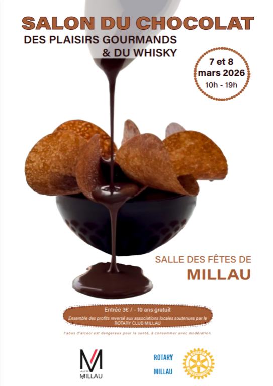 Du07marsà08marsDu 10h00 à 19h00 Tout public, PayantSalon, foireSalon du chocolat, des plaisirs gourmands et du Whisky Un évènement organisé par le Rotary de MillauAjouter à mon calendrierAvis au gourmand, le salon du chocolat est de retour à la salle des fêtes de Millau les 7 et 8 mars !Dégustation et animation sont au programme ! Plus de détails à venir Entrée 3 euros, gratuit pour les moins de 10 ans.PrécédentRetour à la listeSuivant
